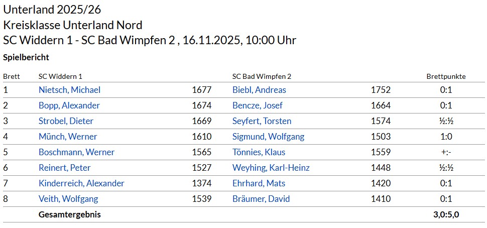 In der Tabelle rückte der Schachclub auf Platz 4 vor. In der 3. Runde am 16.11.2025 ist der noch ungeschlagene Tabellenzweite SC Bad Wimpfen 2 zu Gast in Widdern, gegen den man im Vorjahr knapp mit 4,5:3,5 gewonnen hat.