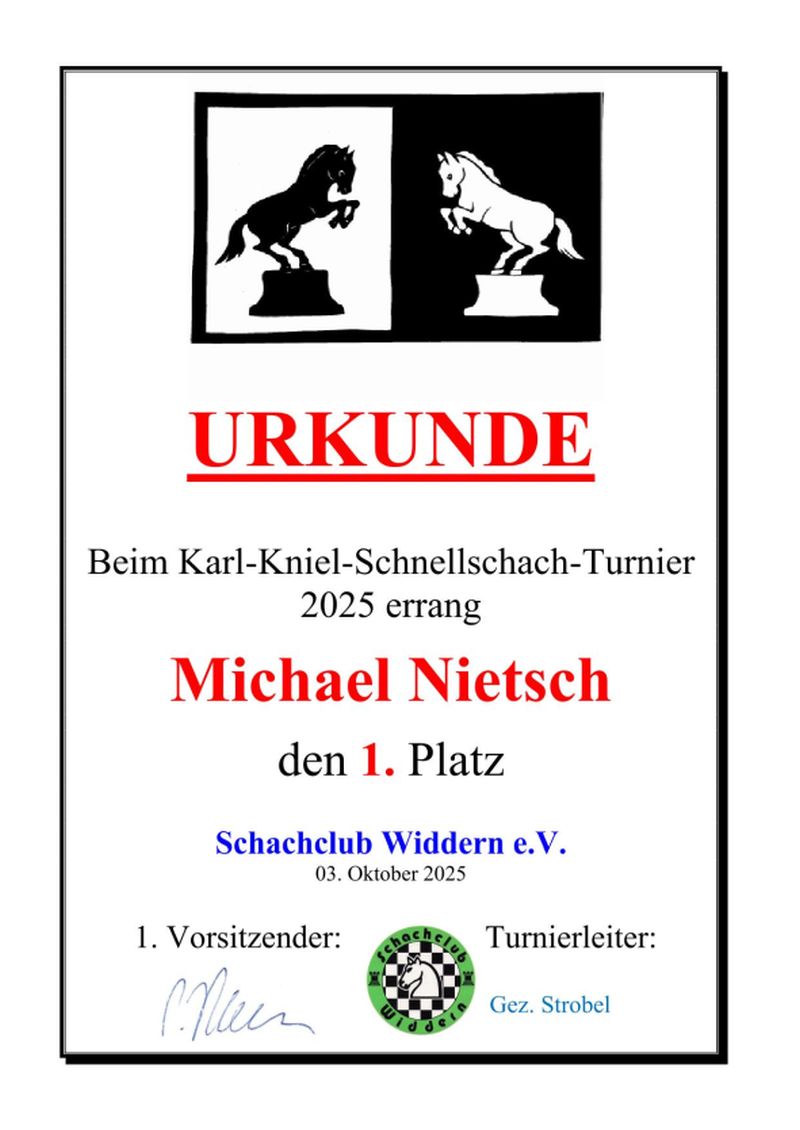 Es ist schon zur Tradition geworden, dass der Schachclub jedes Jahr am Tag der Deutschen Einheit zum Gedenken an den unvergessenen Karl Kniel (gestorben 1994) ein Schnellschachturnier für seine Mitglieder veranstaltet (15 Minuten Bedenkzeit).
